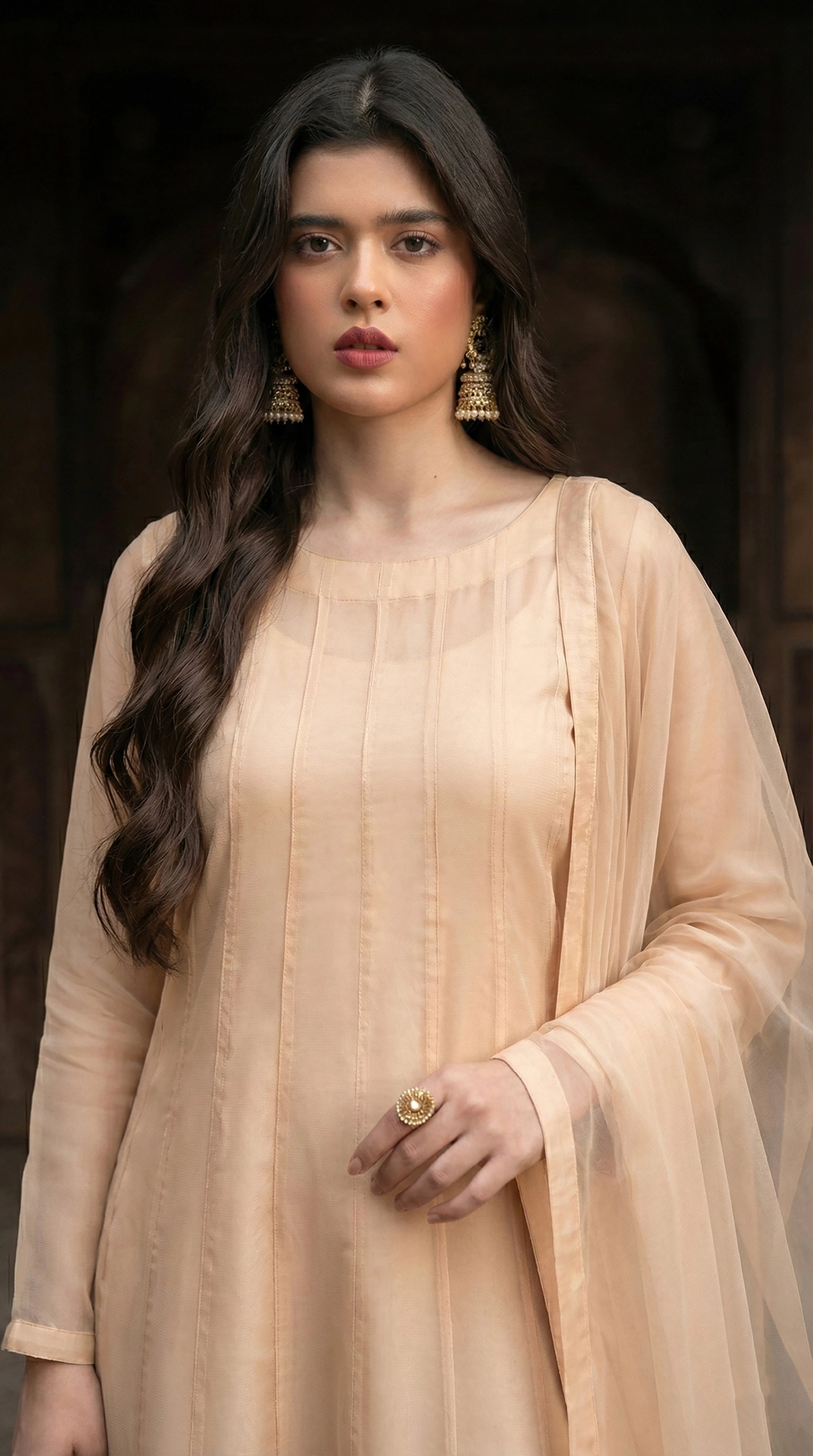 This plain stitched minimal kalidaar kurta is crafted in ultra-fine Bareeze net with attached cotton silk lining for structure and modest coverage. Designed with evenly distributed kalis, it creates a balanced traditional flow without excess volume. Paired with a straight raw silk trouser and a matching net dupatta, this set offers a refined festive look rooted in classic silhouette with modern restraint.