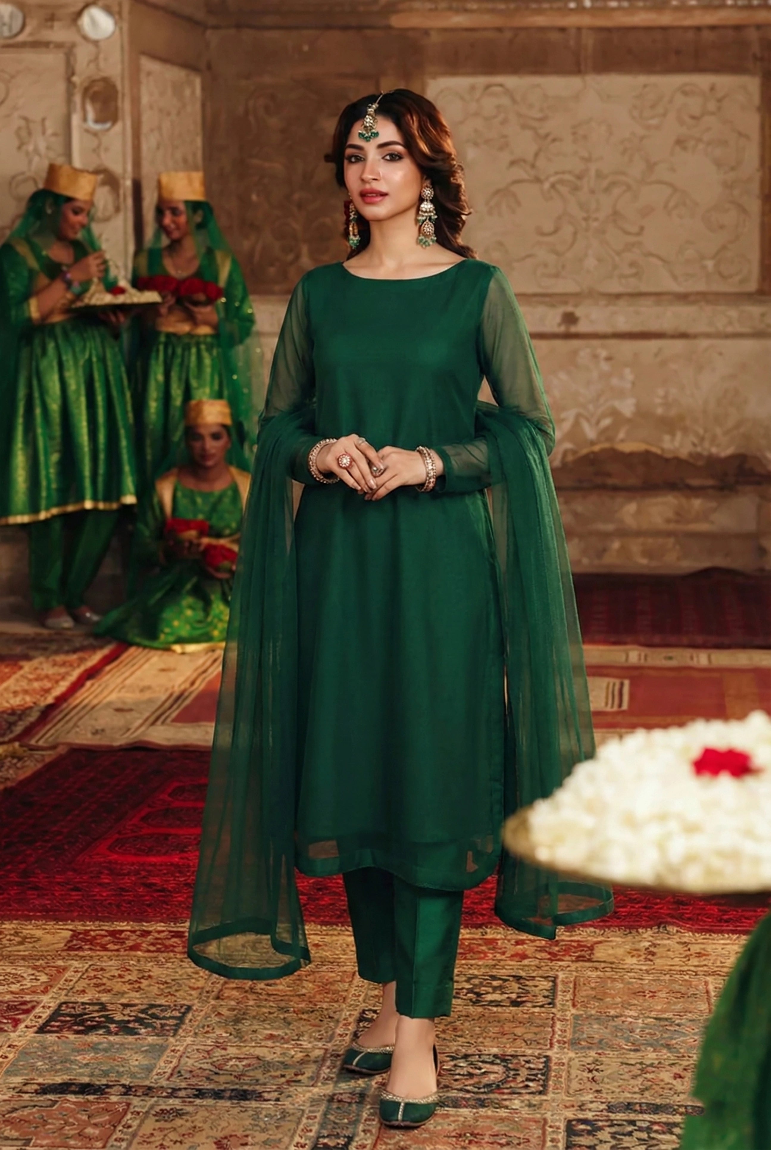 This plain stitched A-line kurta set is designed in ultra-fine Bareeze net with attached cotton silk lining to maintain shape and controlled flare. The A-line cut offers ease of movement without excess volume, paired with a straight raw silk cigarette trouser for structure. Finished with a matching net dupatta, this set delivers a clean, minimal festive look suitable for all-season wear.