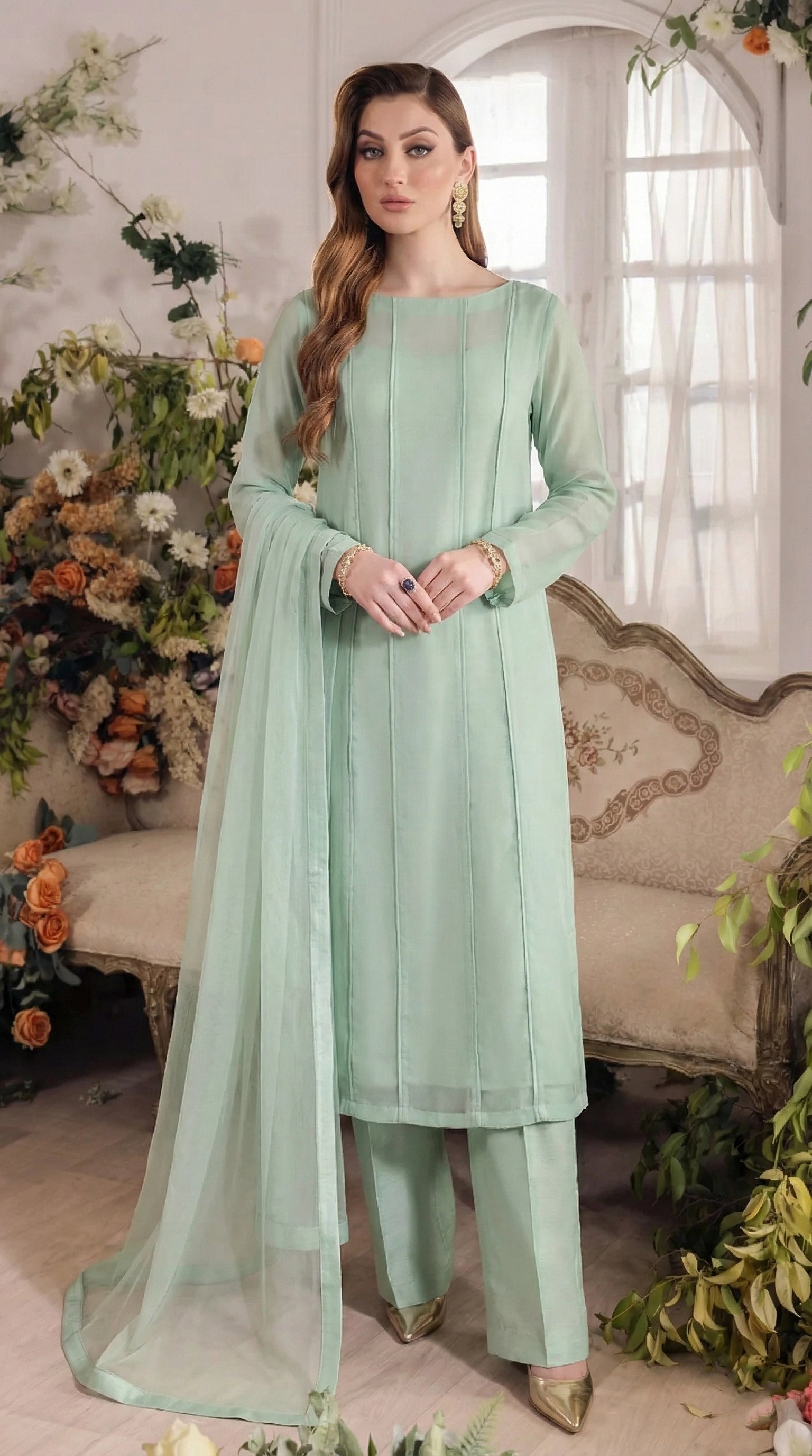 This plain stitched panel shirt is crafted in ultra-fine Bareeze net with attached cotton silk lining for structure, depth, and modest coverage. Designed with a clean panel construction that creates a straight, elongated silhouette without flare. Paired with a straight raw silk trouser and a matching net dupatta, this set offers a fresh, minimal festive look suitable for all-season wear.