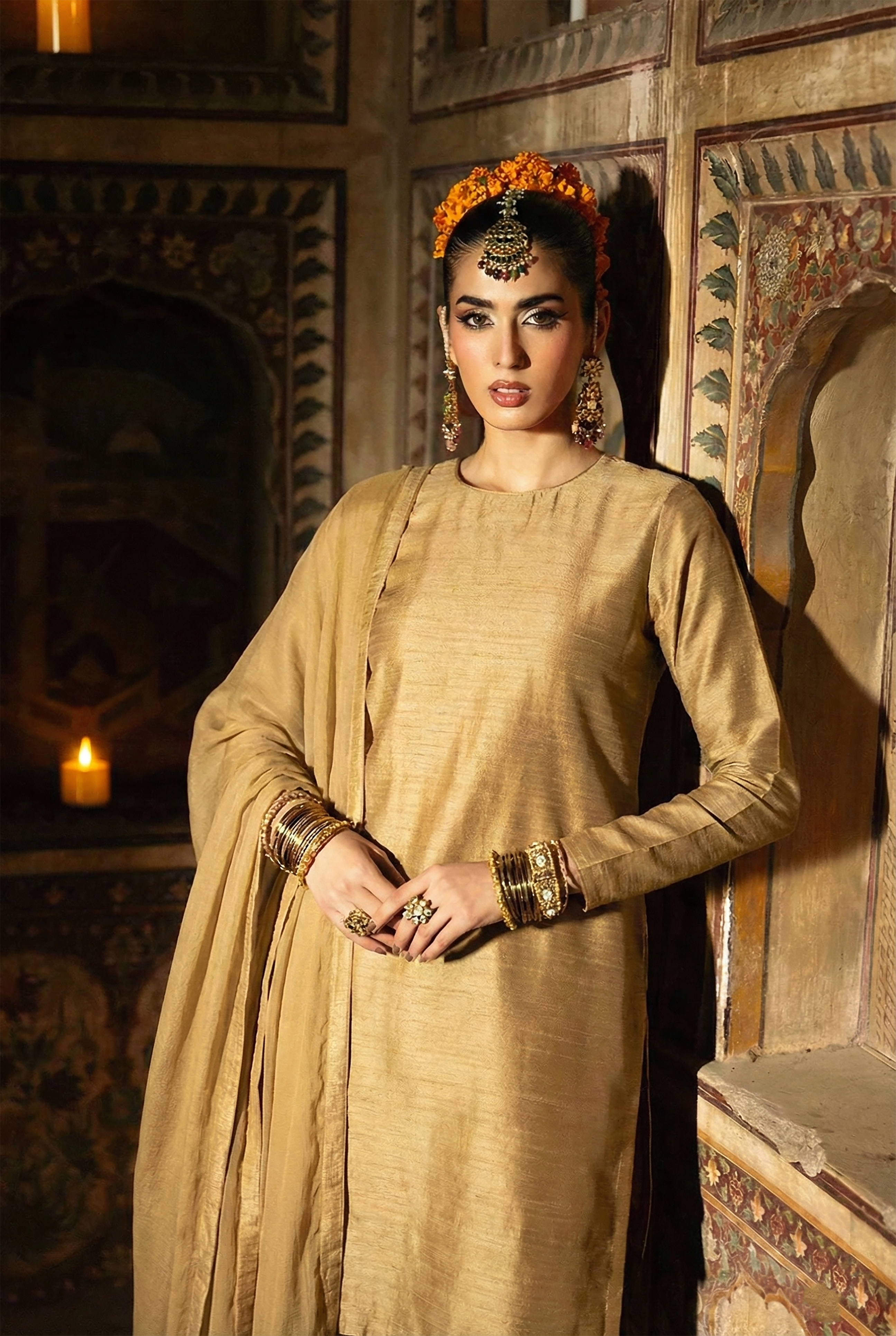 Notes: A signature of the ROZAIB Raw Silk Core, this stitched suit is presented in a sophisticated Antique Gold. The stitched dress features a muted metallic warmth without artificial shine, emphasizing the heritage richness of the fabric. As a premium ready to wear executive choice, it is tailored with a single-panel front for a sharp, linear silhouette and reinforced 9-inch side slits. This ensemble highlights the organic slub of raw silk and the precision of pressed, sharp seams, delivering an authoritative look for formal and festive occasions.