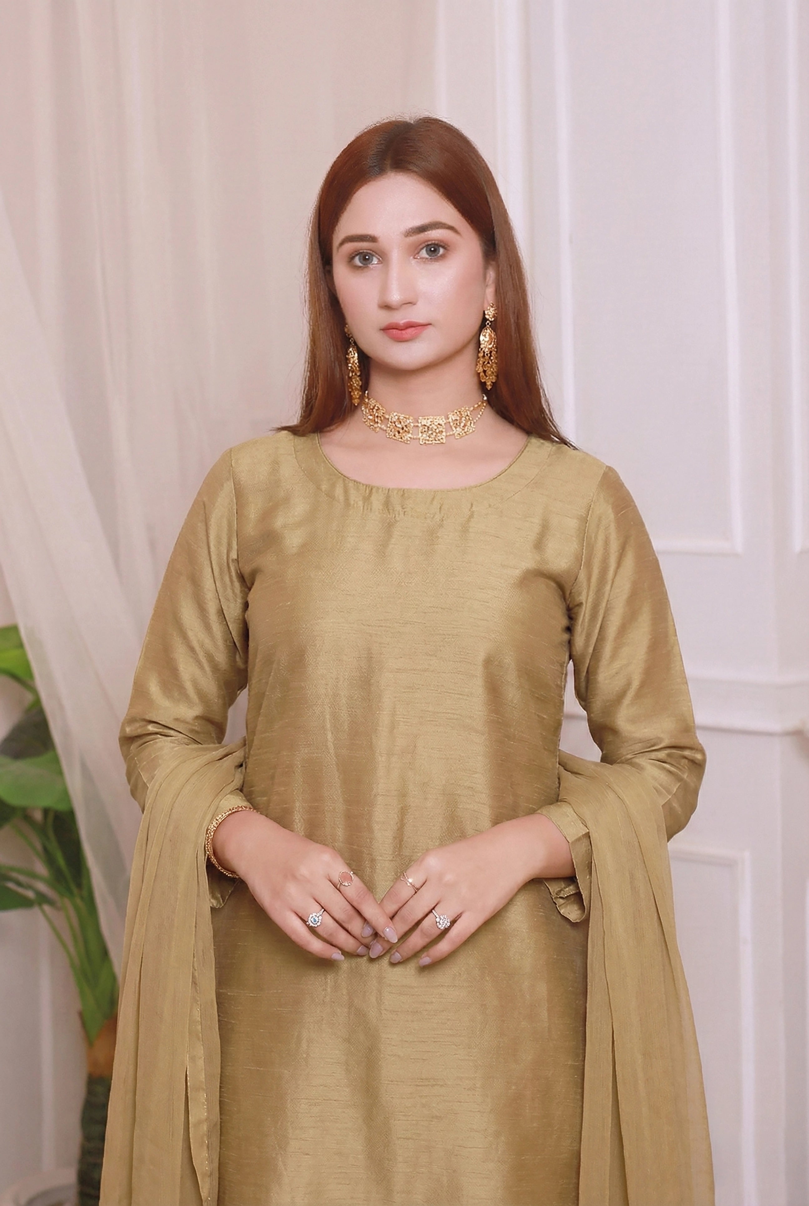 Antique Gold Luxury Chiffon Front Slit Frock Set – 3 Piece
