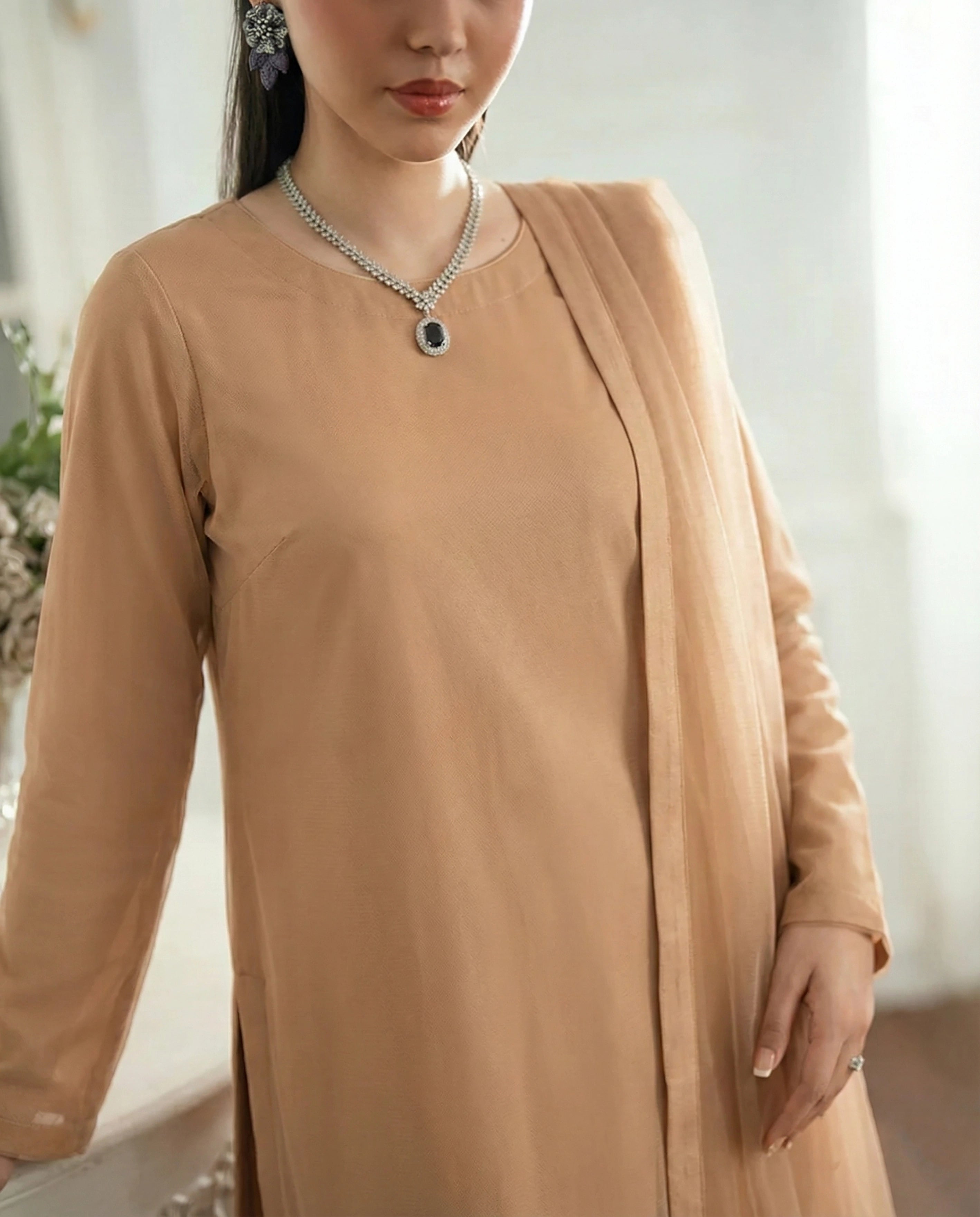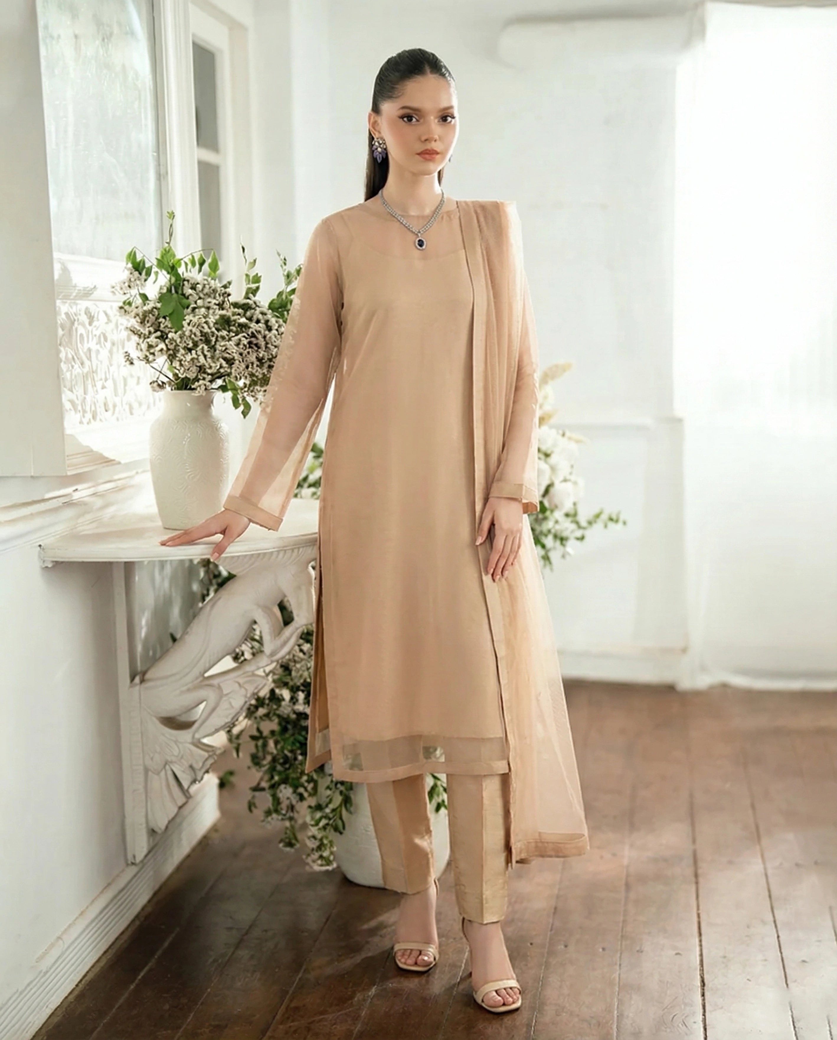 Notes: A clean long straight kurta in biscuit nude crafted from ultra-fine Bareeze net with attached cotton silk lining. Designed for a smooth vertical fall, sharp seams, and a calm neutral tone ideal for minimal festive and day-to-evening wear.