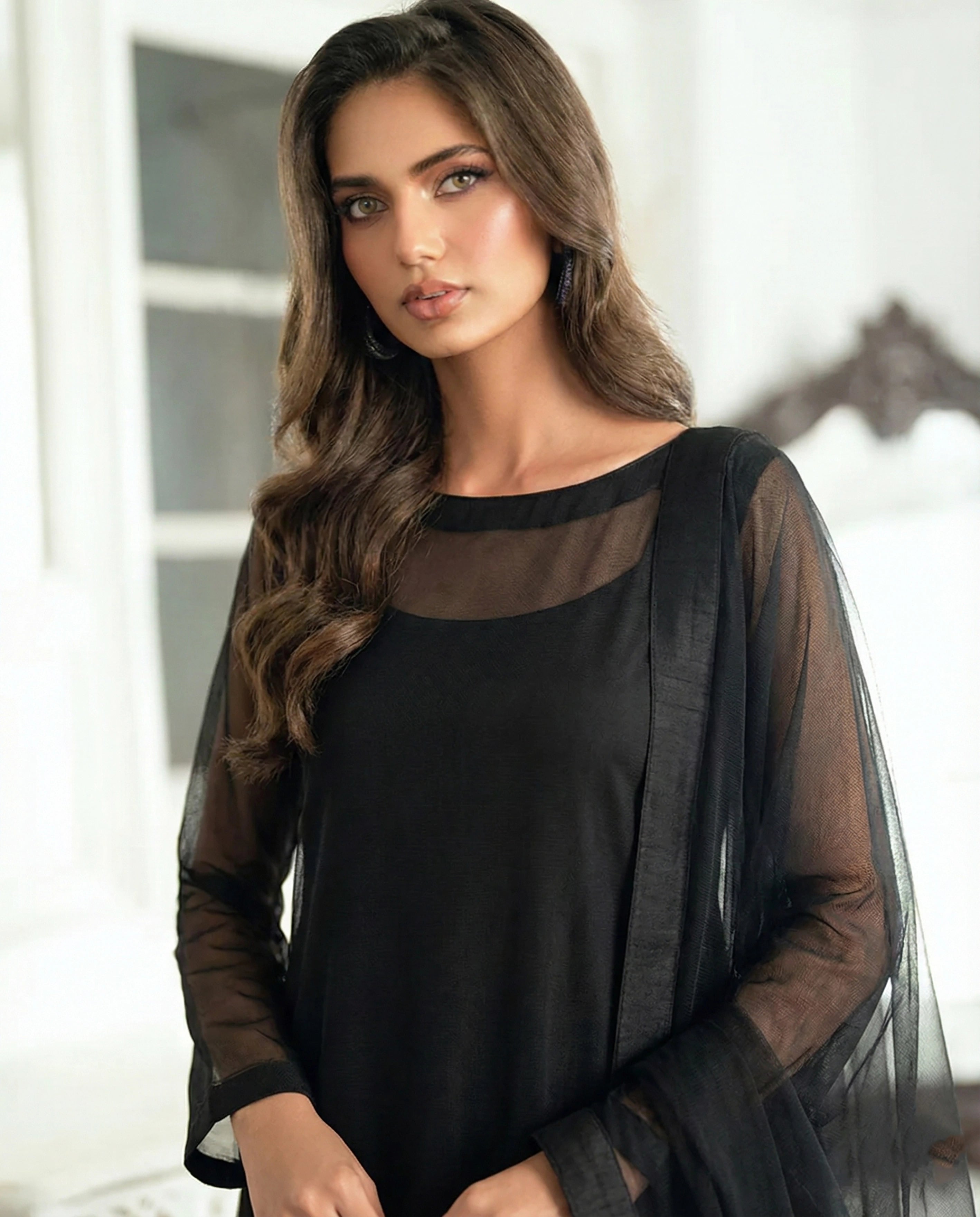 Notes: A classic straight-cut black long shirt crafted in ultra-fine Bareeze net with attached cotton silk lining for depth enhancement. Designed for a clean vertical fall, sharp silhouette, and timeless festive-to-evening versatility.