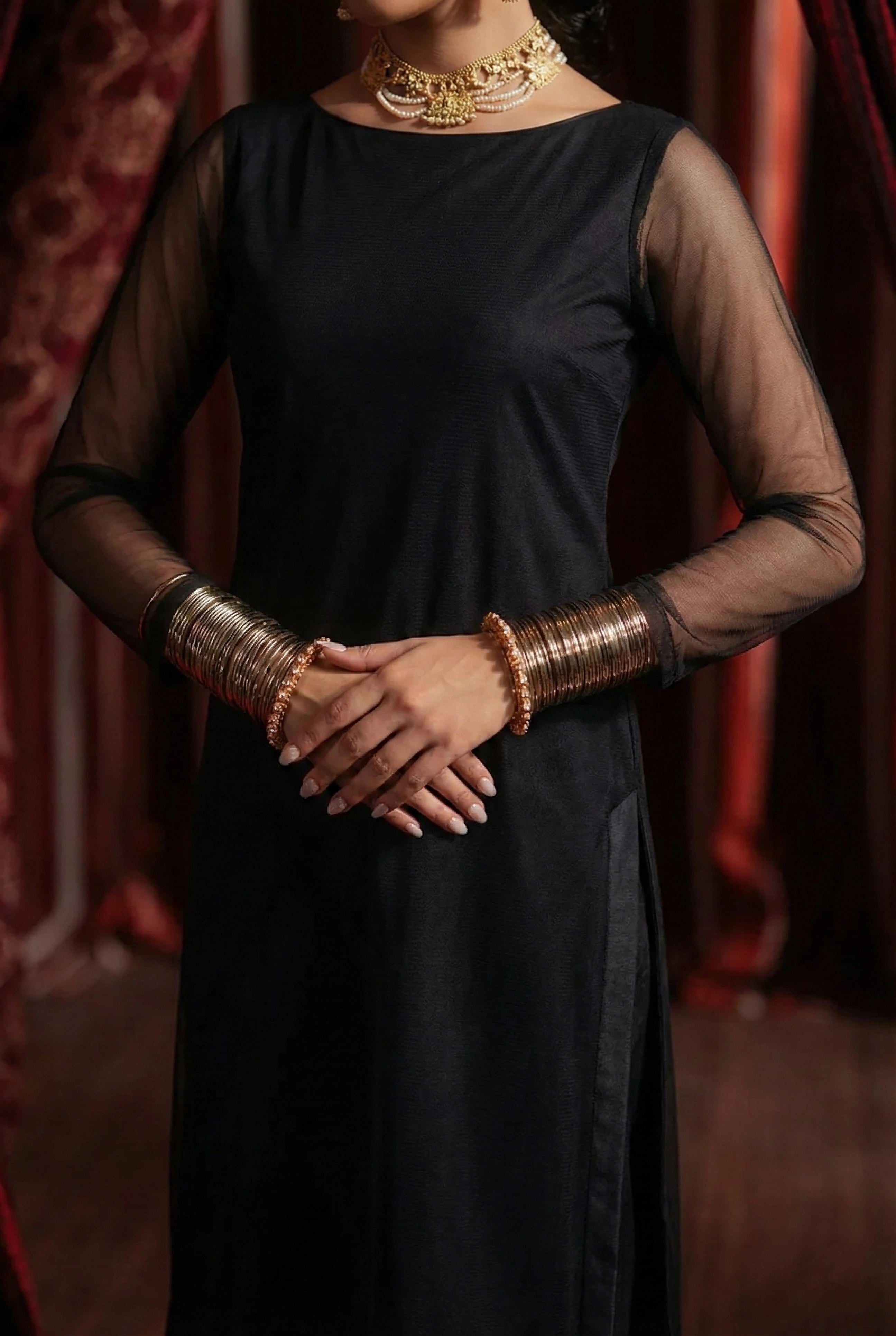 Notes: Straight long kurta crafted in premium Bareeze net, featuring a high side slit with reinforced edges for controlled movement and sharp vertical fall. Attached cotton silk lining enhances opacity, depth, and slit stability while maintaining a matte luxury finish.