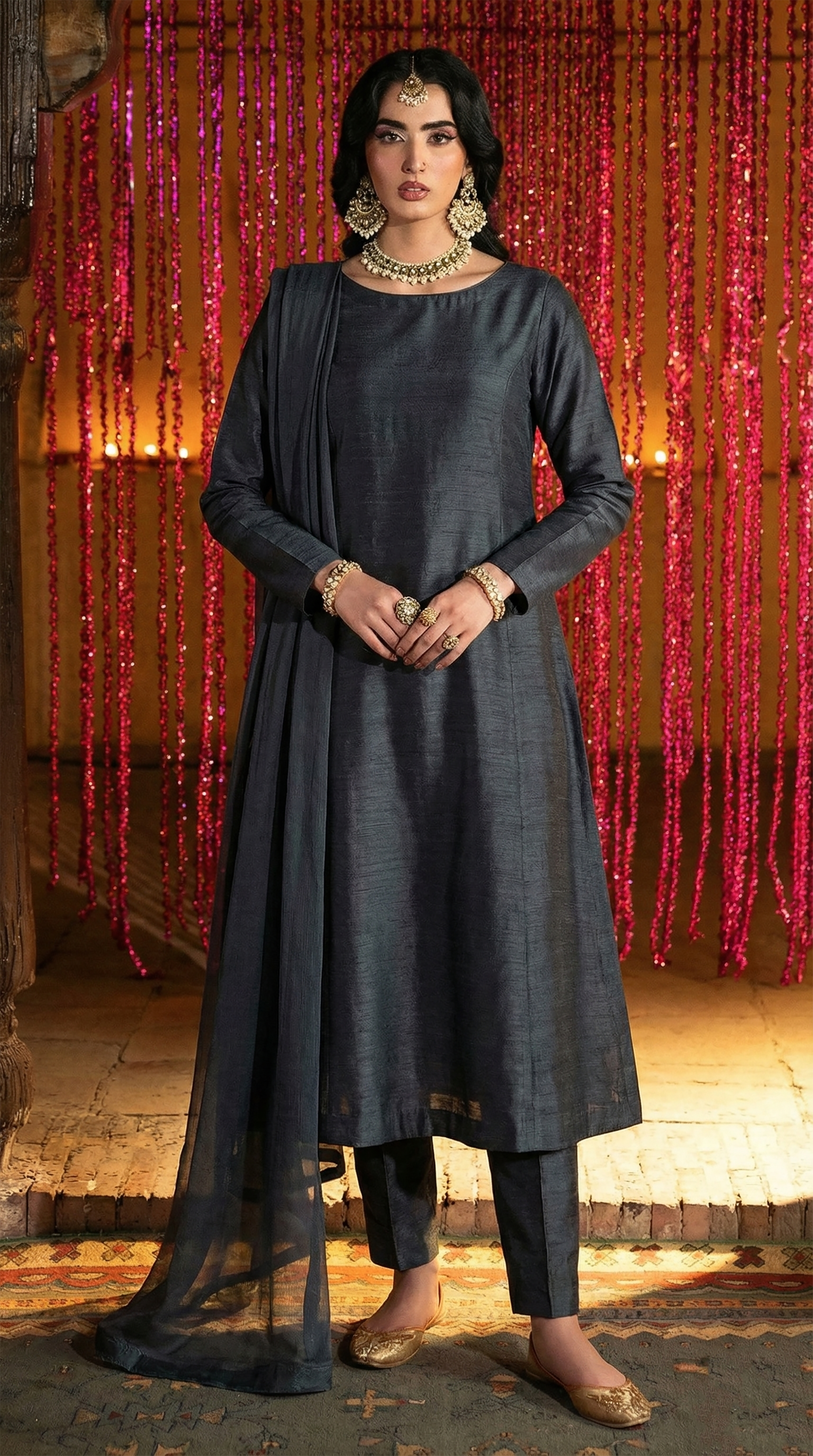 Look Styling: Minimalist jewellery and clean hair styling to emphasize the organic matte texture of the raw silk and the sophisticated charcoal-grey palette of this stitched dress.