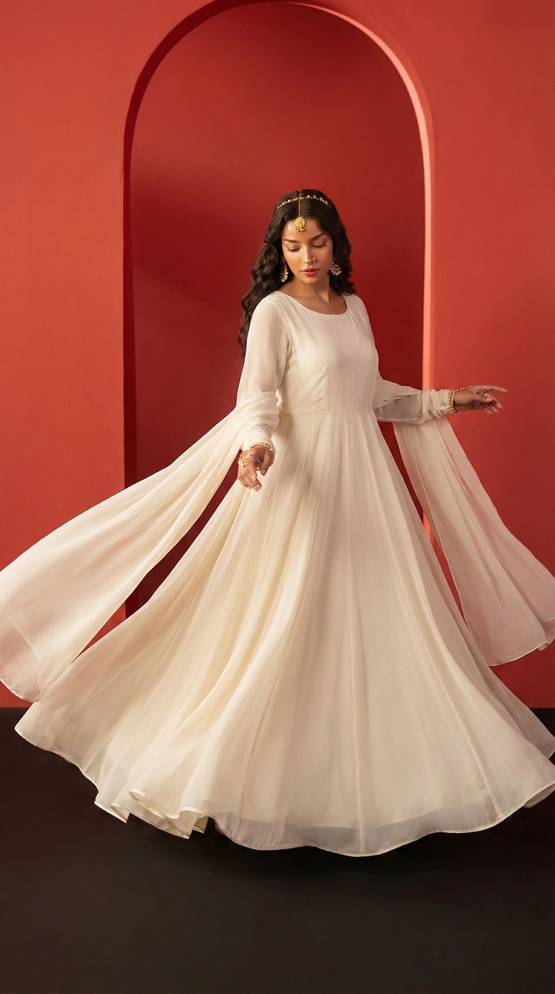 Elegant front slit frock crafted in soft-flow chiffon, designed with a clean round neckline and full sleeves. The medium flare creates graceful movement while maintaining a refined silhouette. Attached lining ensures comfortable coverage without compromising the natural chiffon fall. A timeless Ivory Cream tone that delivers understated luxury for festive and evening wear.