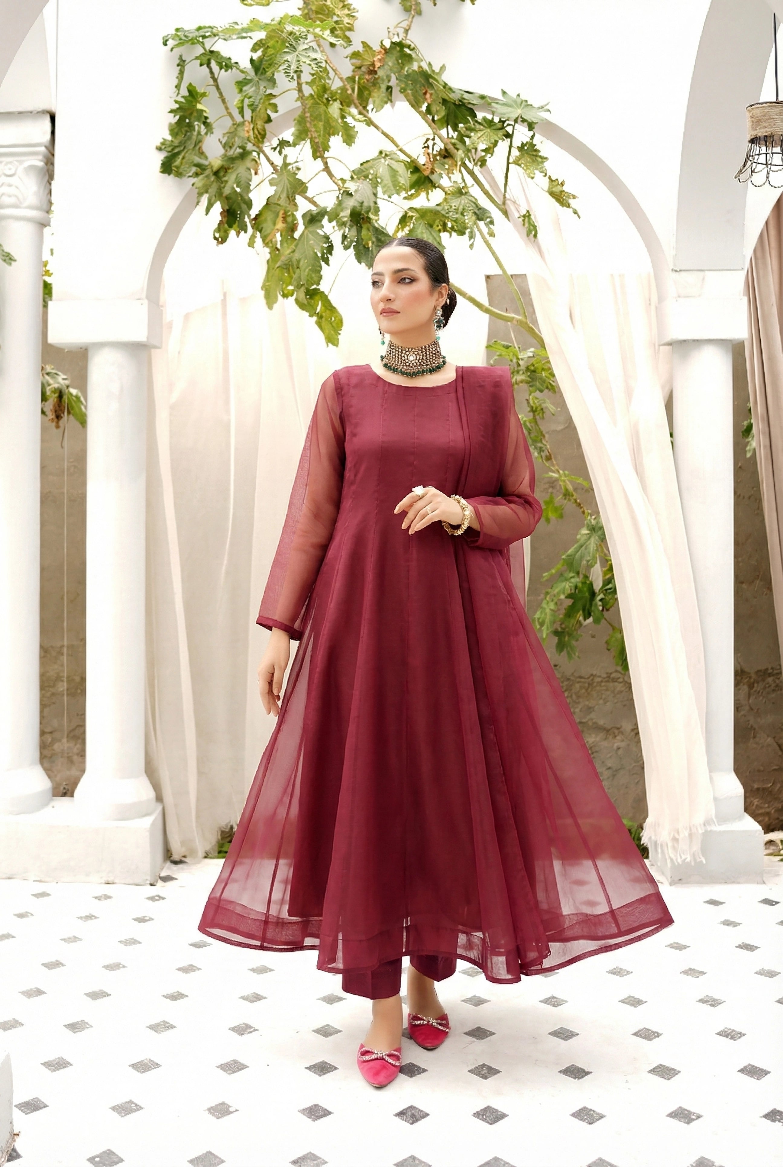 Elegant long organza frock designed with light, controlled flare for an elongated silhouette. Premium organza texture paired with cotton silk lining ensures structure without stiffness. Clean round neckline and minimal construction deliver a refined festive evening look with effortless luxury.