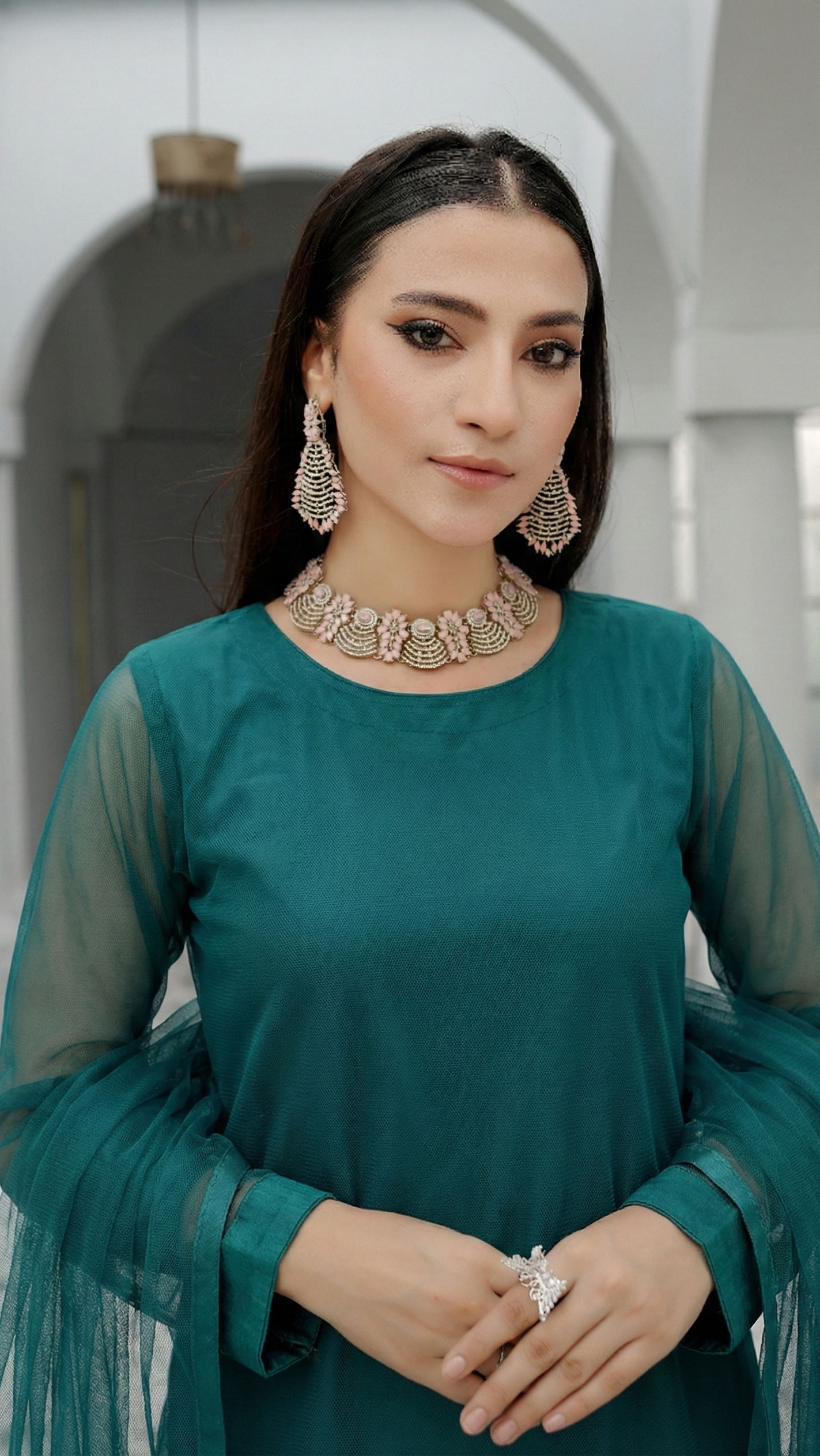 Look Styling: Minimalist jewelry and clean hair styling to showcase the jewel-toned depth of this stitched dress and its micro-jali net texture.