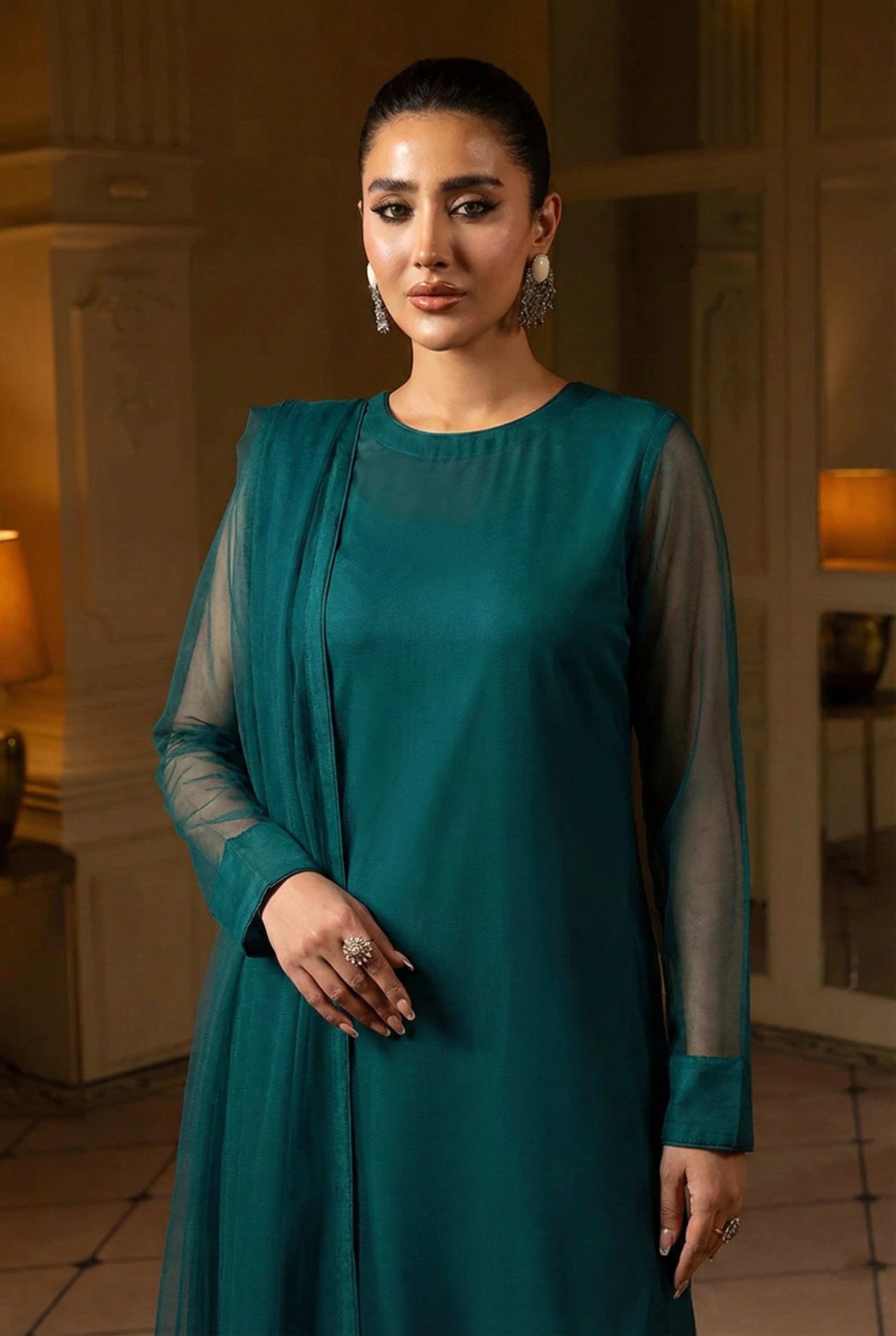 Peacock Green Elegant Front Slit Chiffon Frock Set