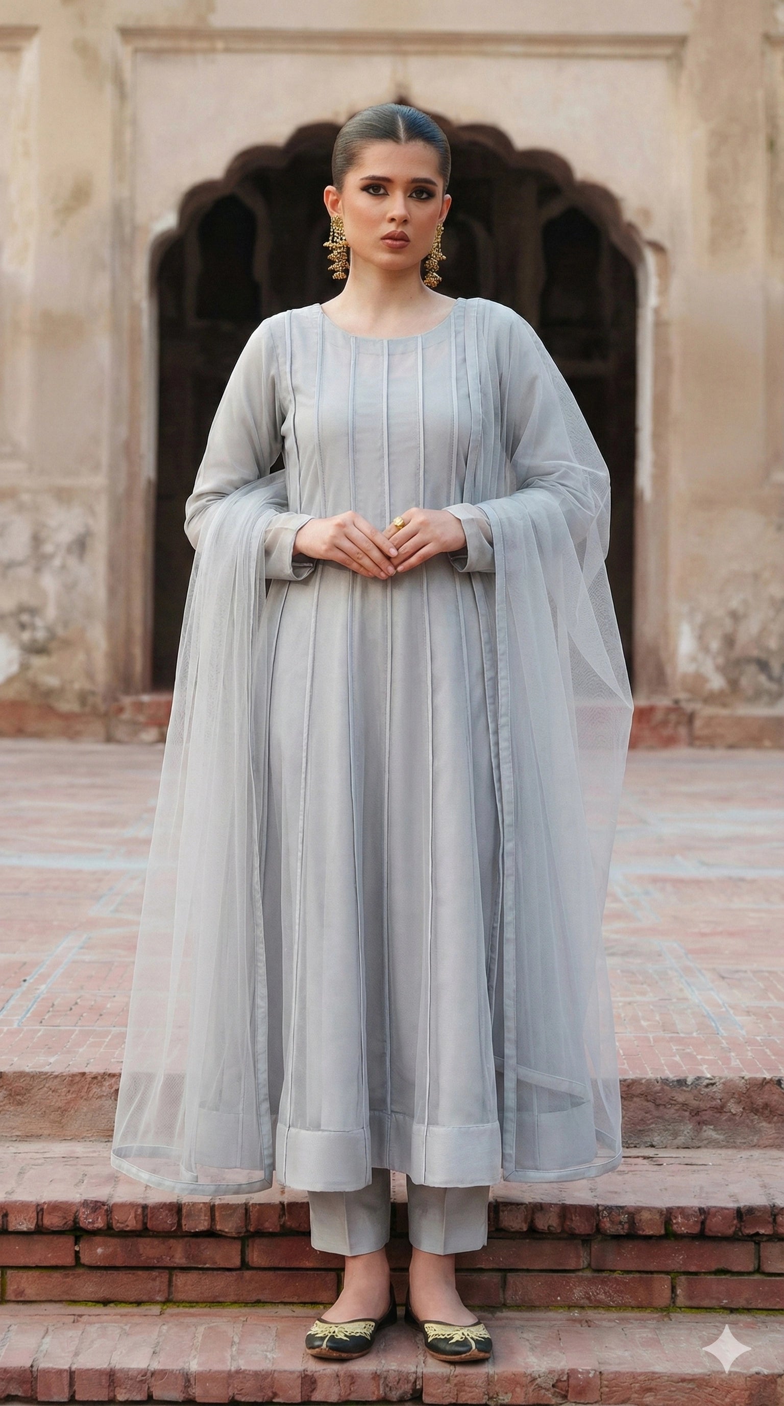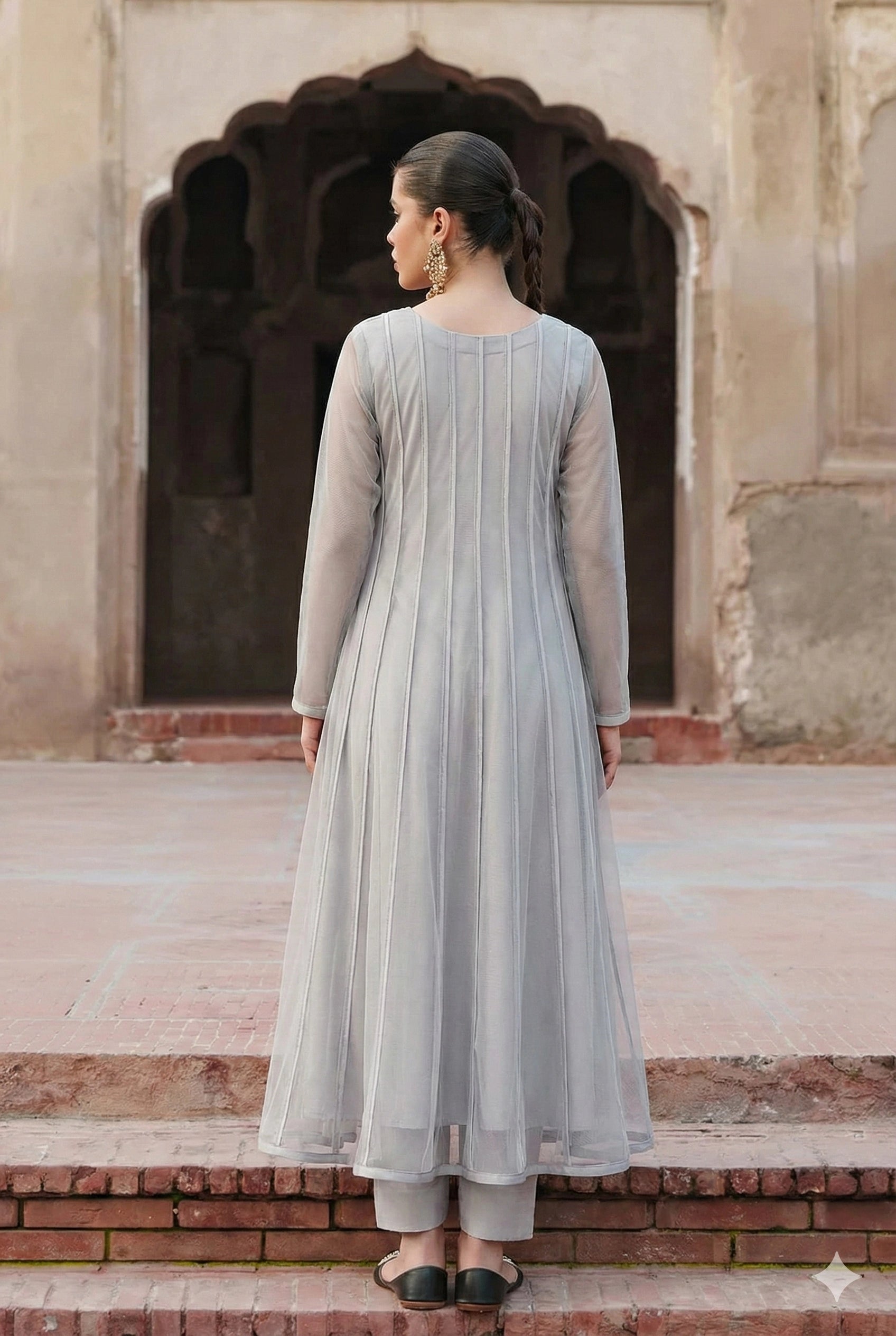 This plain stitched maxi cut pishwas is crafted in ultra-fine Bareeze net with attached cotton silk lining to support structure and maintain modest coverage. Designed with elongated vertical panels and subtle same-tone piping along each seam, it creates a flowing silhouette with refined definition rather than surface decoration. Paired with a straight raw silk trouser and a lightweight net dupatta, this set offers graceful festive movement with a clean, modern finish.