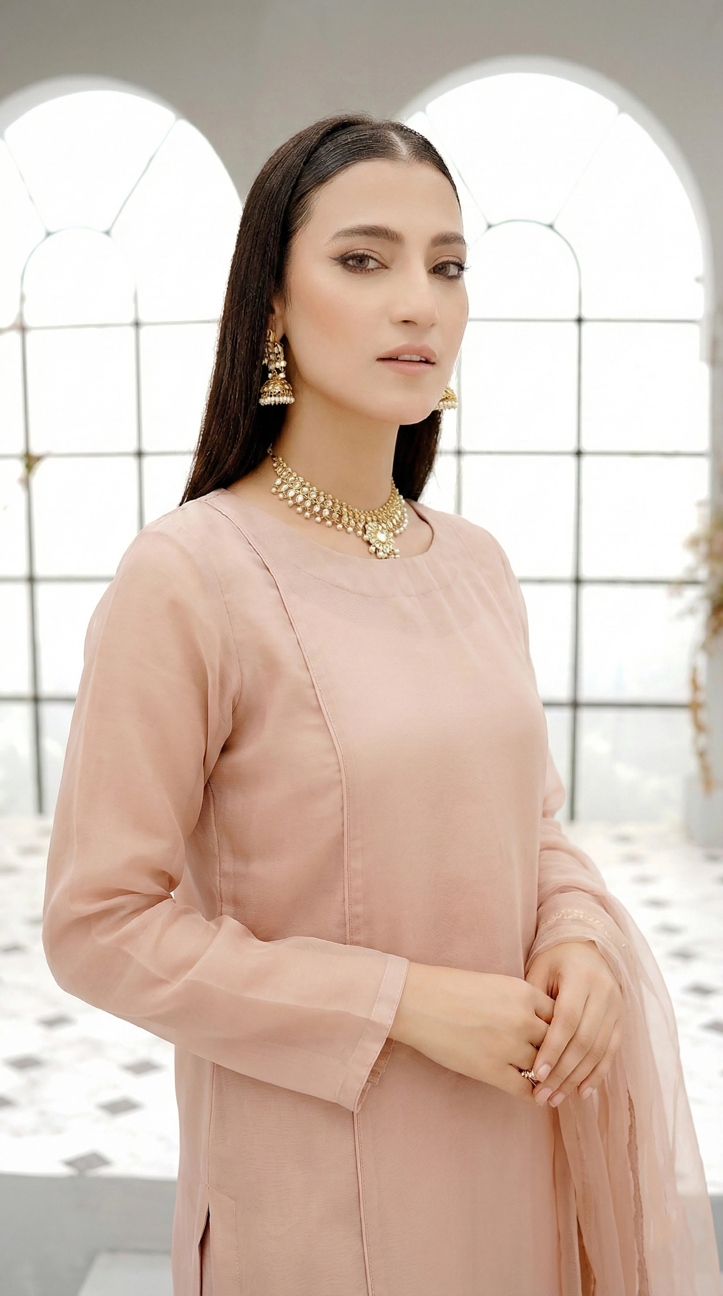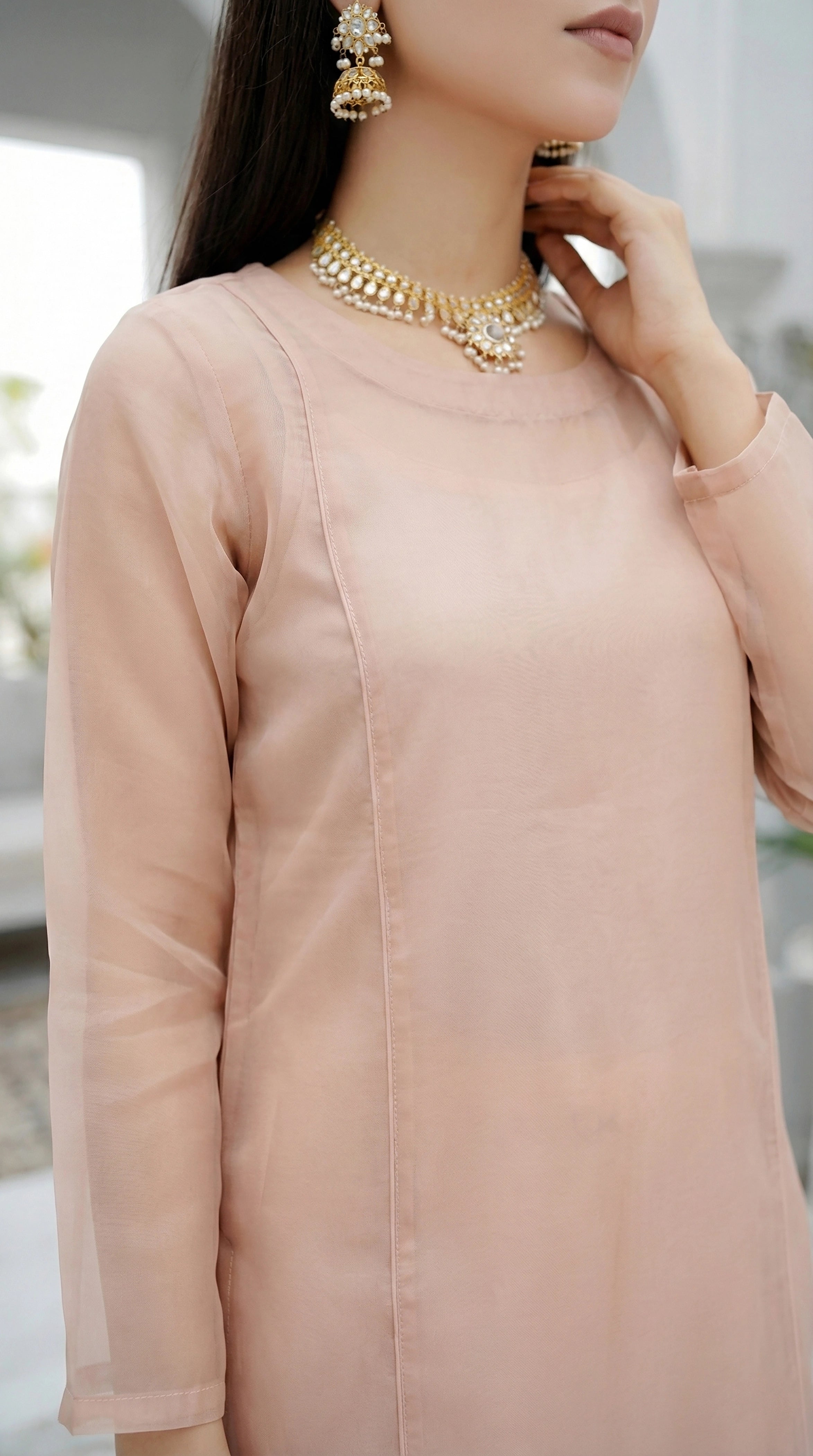 Blush Nude Long Straight Organza Frock Set